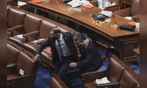 Parliamentarians in House of Representatives conference room bow their heads for hiding place as Trump's supporters flood the parliament building Photo: AP.